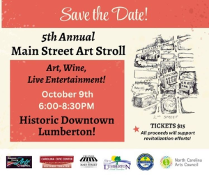 SAVE THE DATE!!! The 5th Annual Main Street Art Stroll is the place to be! Art, wine, live entertainment and more in Historic Downtown Lumberton. Tickets are $15 for the evening stroll. Stroll from one hosting location to another and enjoy the hospitality of our friendly community.