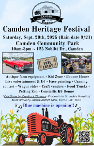 Come out to the Camden Heritage Festival, held annually the third Saturday in September from 10:00am – 3:00pm. Enjoy food trucks, live music, craft vendors, wagon rides, antique tractors, petting zoo, K9 demos, axe-throwing, face painting, fire truck displays, classic cars, Kid Zone with a bounce house and much more. Don’t miss a great day of fall family fun in Camden County!